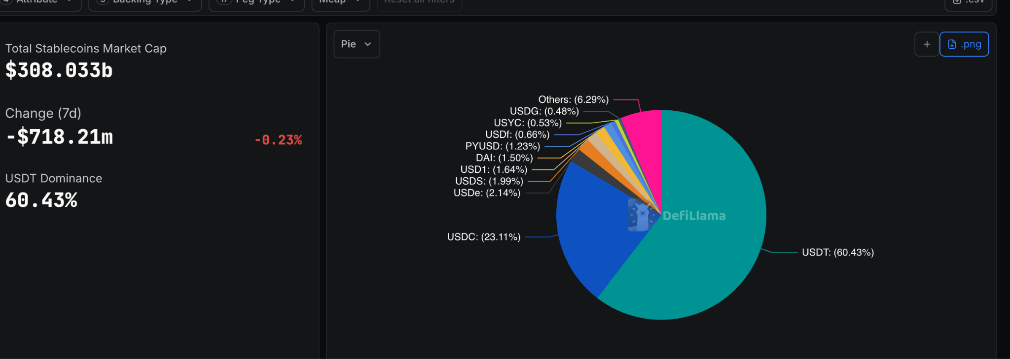 Stablecoin growth is plateauing. The total market cap of stablecoins has been hovering around $308 billion since late 2024. According to recent data, the market dropped by $718 million in the most recent week alone.
