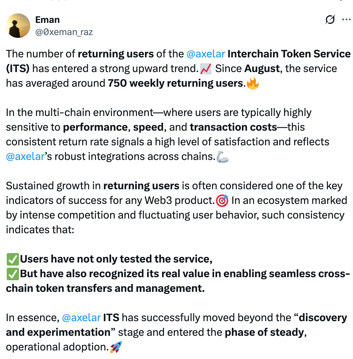 The network also includes the Interchain Token Service (ITS), which preserves token fungibility across chains. Instead of creating wrapped versions of tokens on each chain, ITS maintains a unified token identity, solving the liquidity fragmentation problem that plagues current bridges.