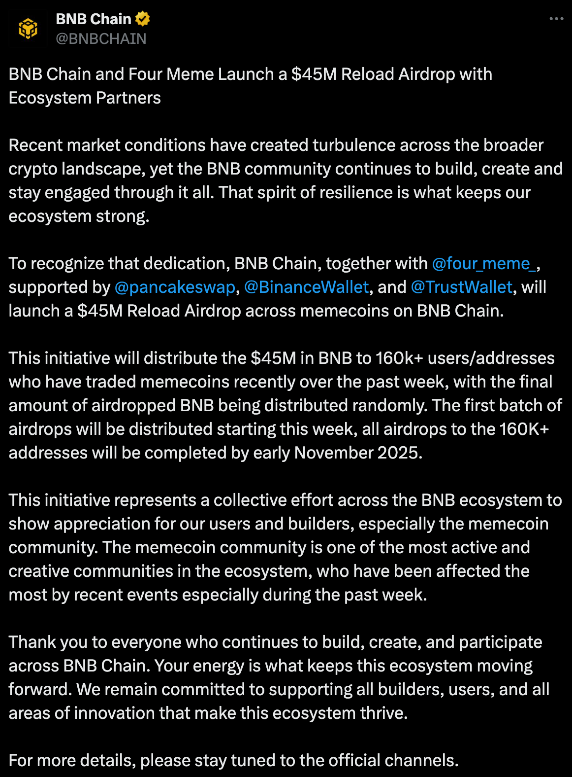 Three days later, Binance and BNB Chain announced a $45 million “reload airdrop” for memecoin traders who lost money in the crash.