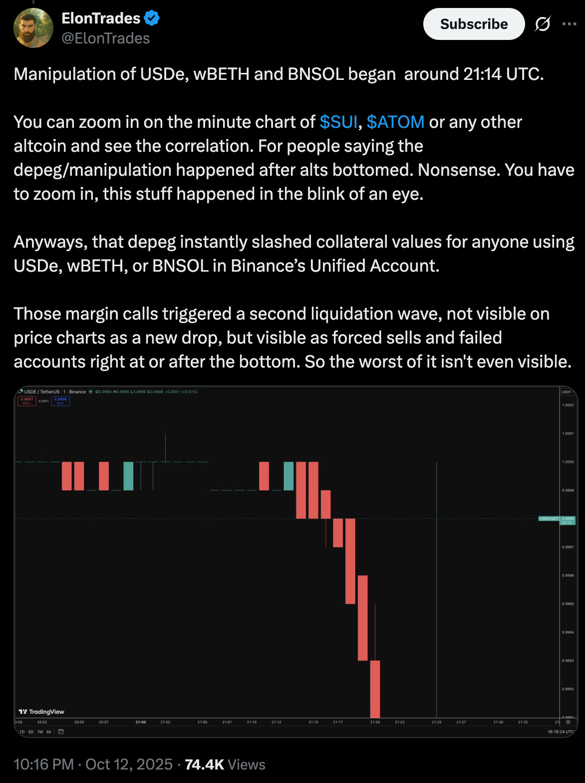 Simultaneously, Ethena’s USDe stablecoin, which maintained its $1 peg on decentralised exchanges like Curve, crashed to $0.65 on Binance. Guy Young, founder of Ethena Labs, explained that Binance was using oracle data from its own thin orderbook instead of external price feeds. That created a massive price discrepancy isolated to Binance, triggering liquidations that wouldn’t have happened on any other venue.