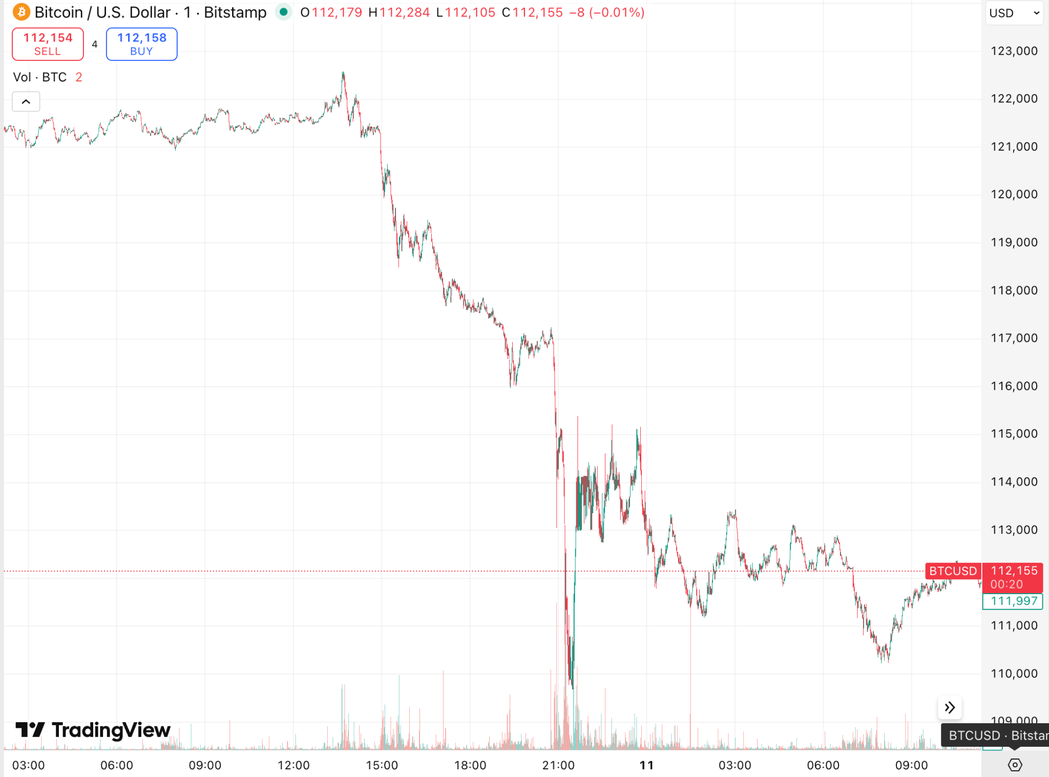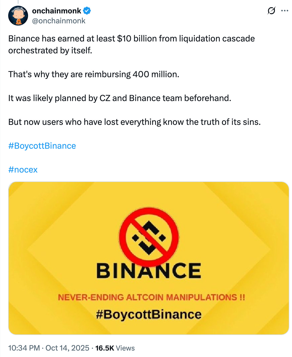 The crash started when President Trump announced 100% tariffs on Chinese imports via Truth Social. Bitcoin dropped from $124,000 to $105,000. Panic selling cascaded through altcoin markets. So far, so normal. Markets do this. Leverage kills people. Tuesday ends in Y.