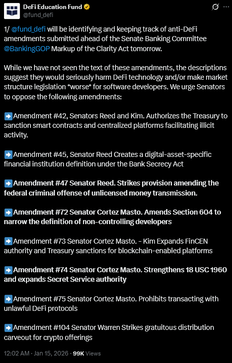 “While we have not seen the text of these amendments, the descriptions suggest they would seriously harm DeFi technology and/or make market structure legislation worse for software developers,” the organisation posted on X.