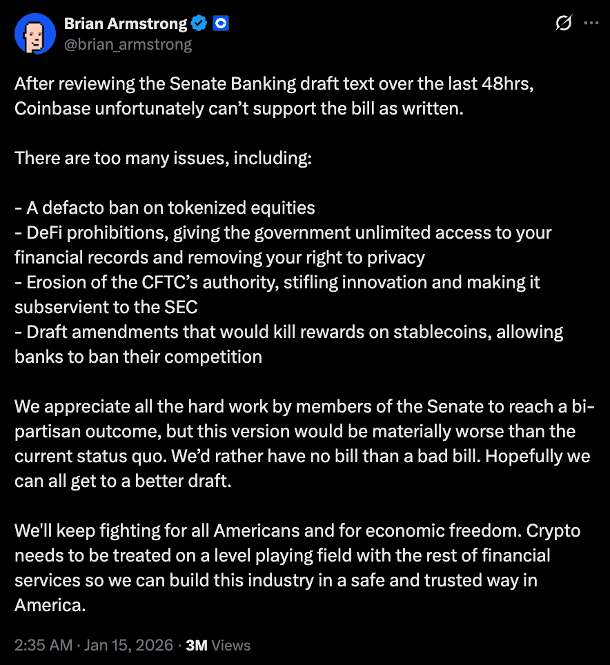 Within 48 hours of reviewing the Senate Banking Committee’s draft, Coinbase publicly withdrew its support. “We’d rather have no bill than a bad bill,” CEO Brian Armstrong tweeted, arguing that the proposal claiming to provide regulatory clarity would leave the industry worse off than under the status quo.