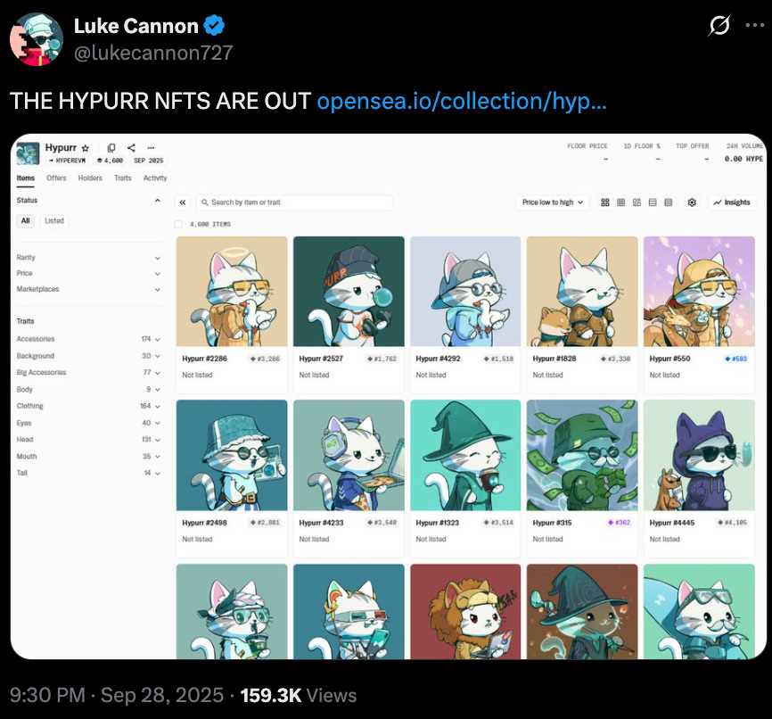 On September 28, the wait ended as Hyperliquid pushed Hypurr live on its HyperEVM. Eligible users, mostly early traders, woke up to find these cats in their wallets. The floor price shot past $75,000. By the next day, Hypurr had become the second-most traded NFT collection in the world, behind only CryptoPunks.