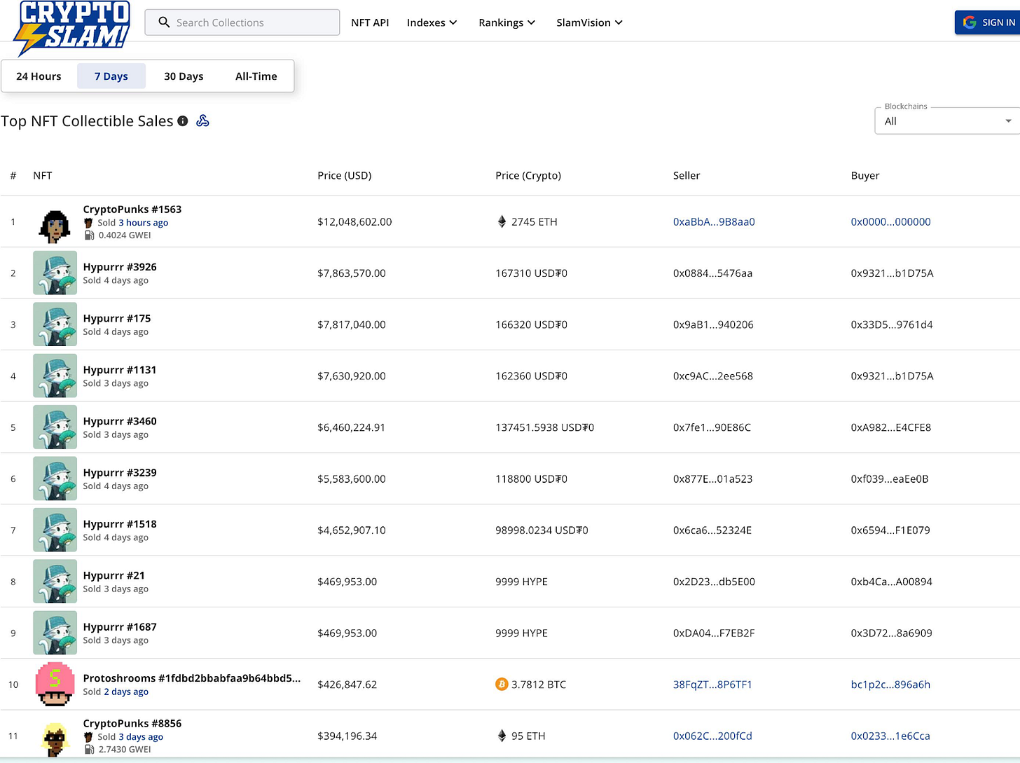 Nine out of the top 10 NFTs sold in the last seven days were from the Hypurr cats collection.