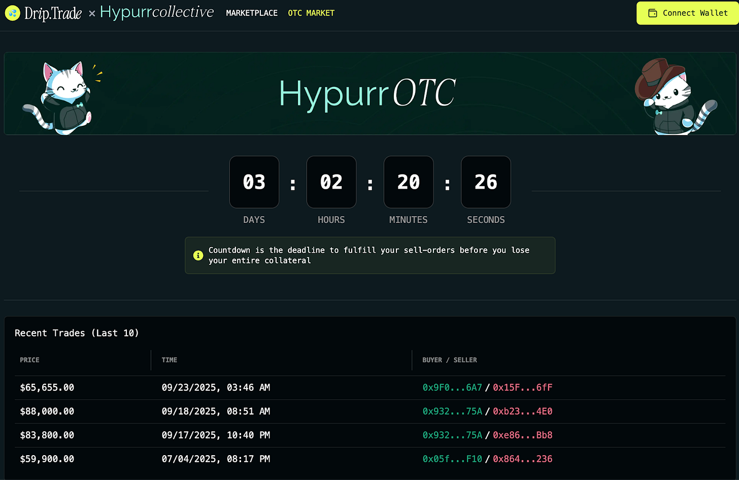 Then, in early July, almost three months before the official launch of Hypurr NFTs, people started trading them over the counter on drip.trade, a high-frequency NFT marketplace on Hyperliquid.