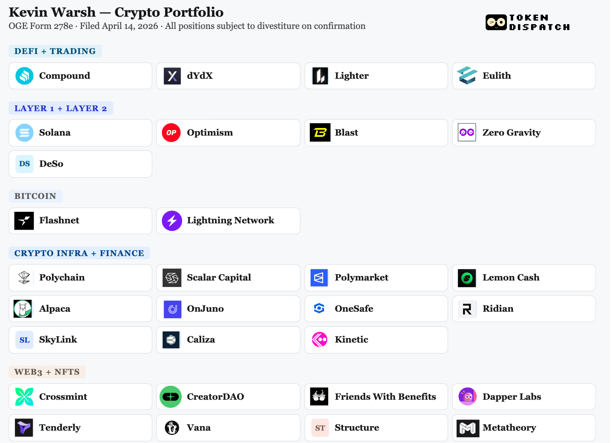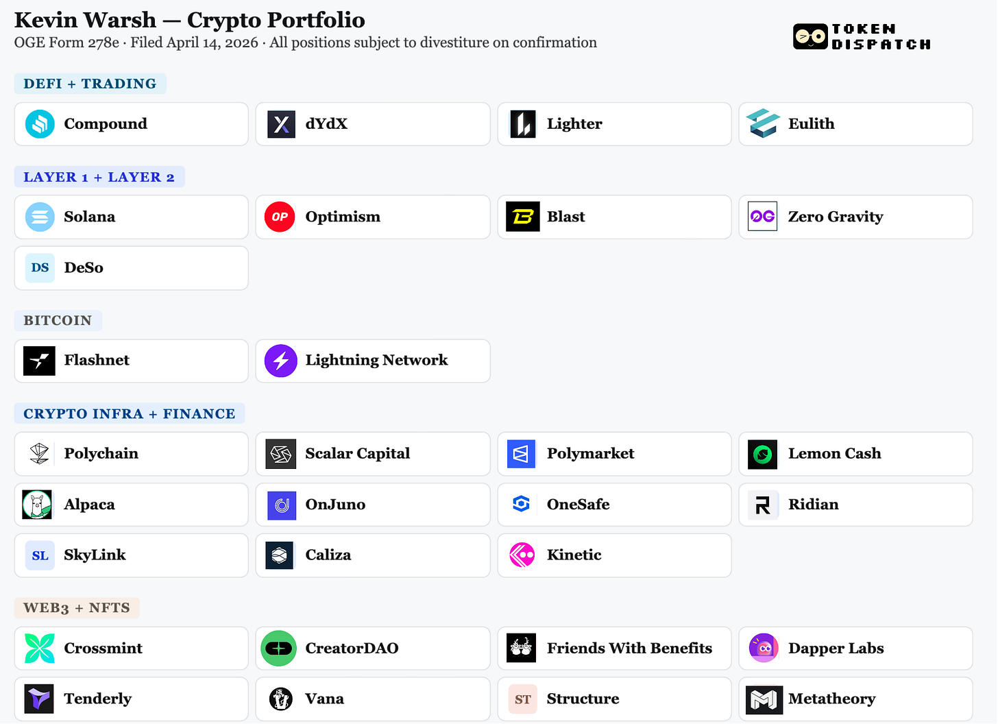 Warsh has promised to divest everything. Selling liquid token positions is straightforward enough. Unwinding LP stakes in Polychain Capital or venture fund positions in illiquid early-stage companies is considerably less so. Some funds with multiple LPs would not typically require divestiture under OGE rules. But the OGE certifying official specifically flagged the Juggernaut Fund positions and made full divestiture a condition of compliance. The underlying assets in those positions remain undisclosed due to pre-existing confidentiality agreements.