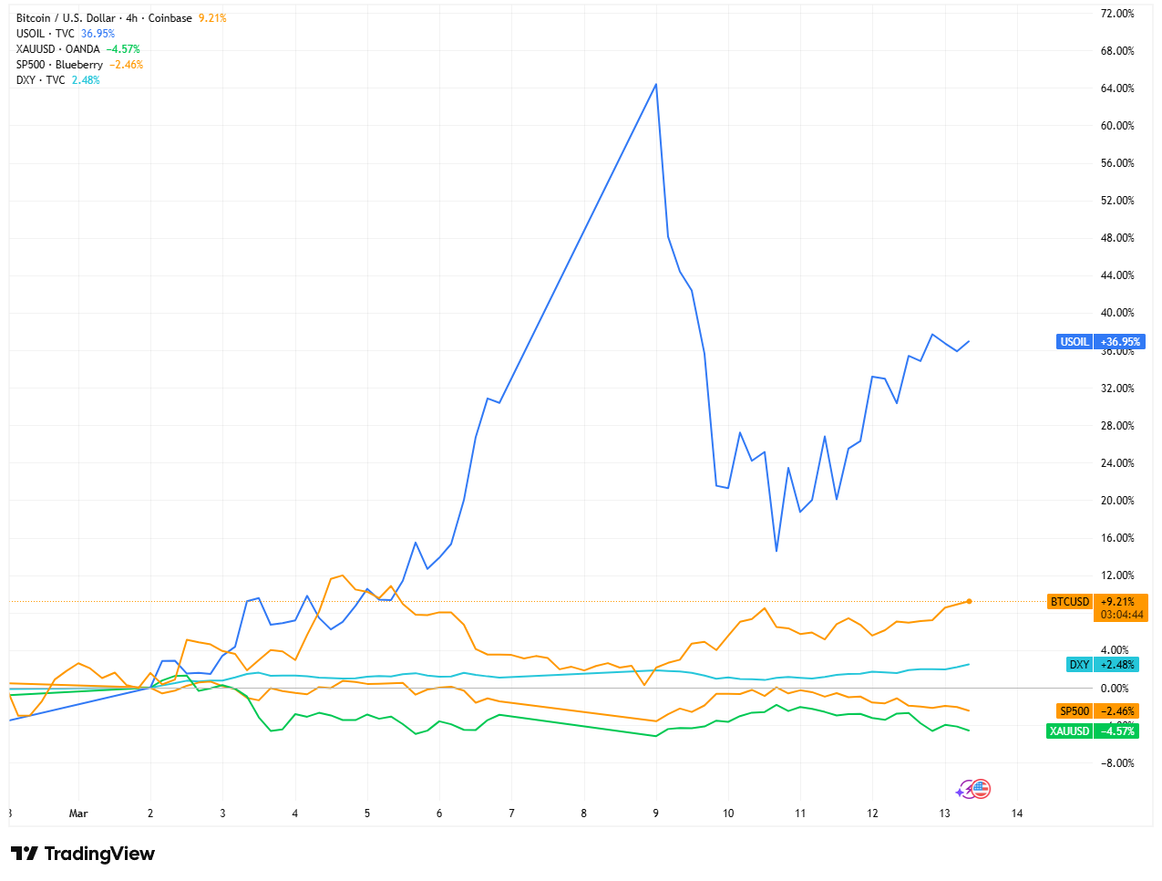 The U.S. and Israel launched strikes on Iran on February 28, and the Strait of Hormuz, through which roughly a fifth of the worldâs oil and LNG shipments pass, was all but shut down. Oil did what oil does when supply arteries get squeezed: it panicked. USOIL spiked over 65% in a week before pulling back to around +37% by the time this edition goes out. Your timeline was likely flooded with memes about natural gas rationing, oil tanker rerouting, and people suddenly becoming armchair experts on Persian Gulf chokepoints.