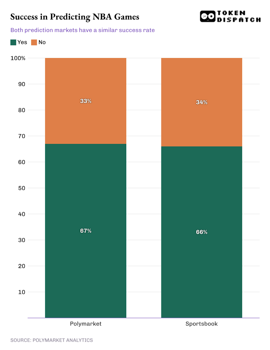 But extensive research shows that market-based odds are strong predictors of real-world outcomes. Academic studies on sports betting markets dating back decades show that bookmaker odds are highly efficient predictors of game outcomes. More recently, prediction markets have been compared directly to sportsbooks. In a study of roughly 1,000 NBA games from the 2024–25 season, both Polymarket and Sportsbook saw similar success in predicting the winners.