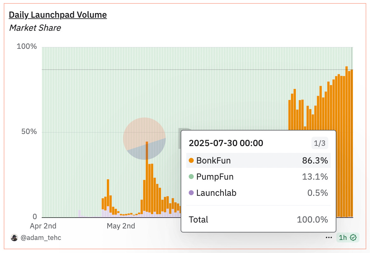 Pump.fun, the undisputed monarch that once commanded 88% of all token launches just a month ago, now clings to a mere 13% market share while its upstart rival Let'sBONK has seized 86% of the territory.
