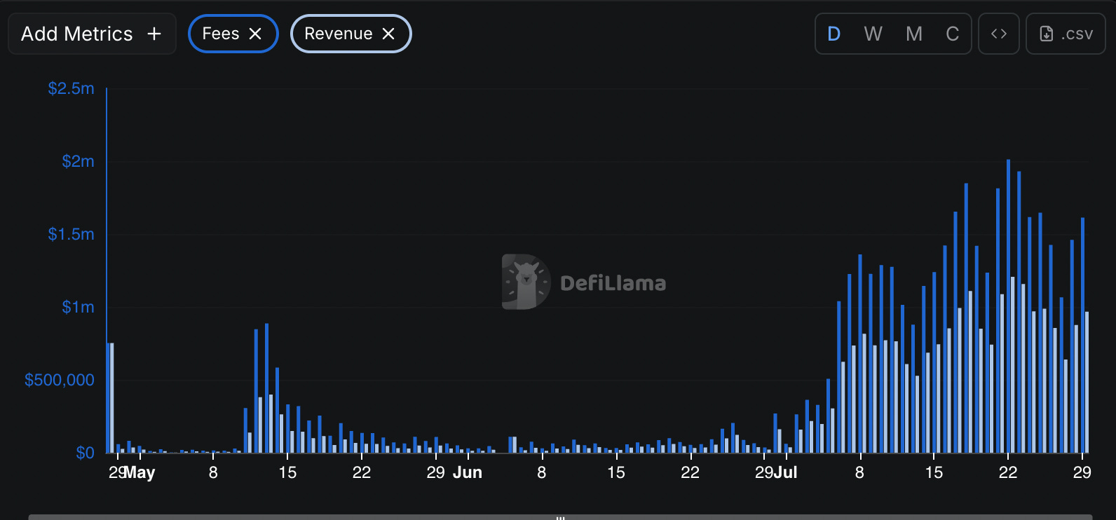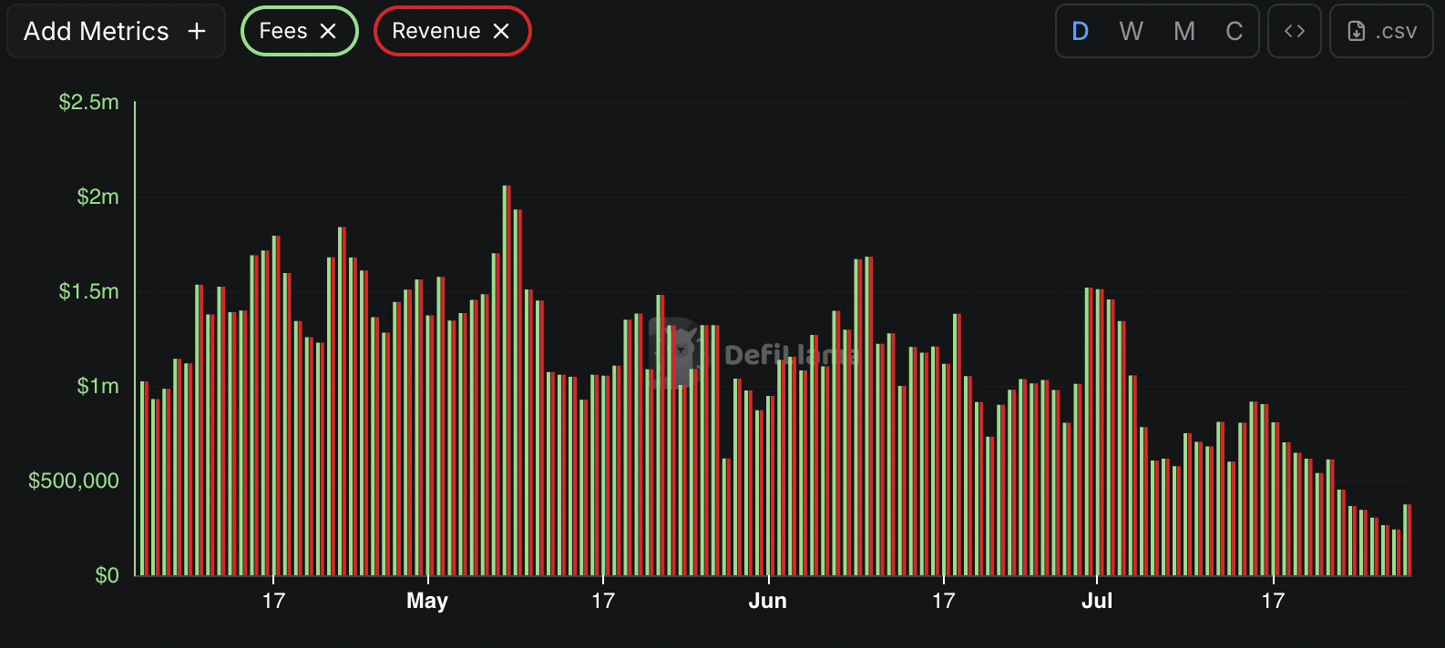 Let'sBONK's revenue climbed steadily from near-zero in May to consistent $1M+ daily figures by July. Meanwhile, Pump.fun's revenue has cratered from January peaks above $7 million to levels not seen since September 2024.