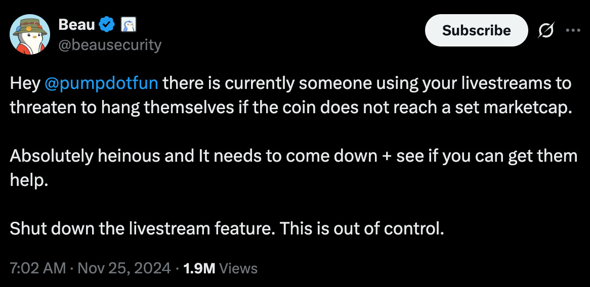 This went about as well as you'd expect. November 2024, people started doing increasingly crazy things on camera to get attention for their tokens. The platform became what users charitably called "a pipeline of felonies." Suicide threats, animal abuse, and eventually a child appearing on stream threatening family members with a shotgun to pump their token's price.