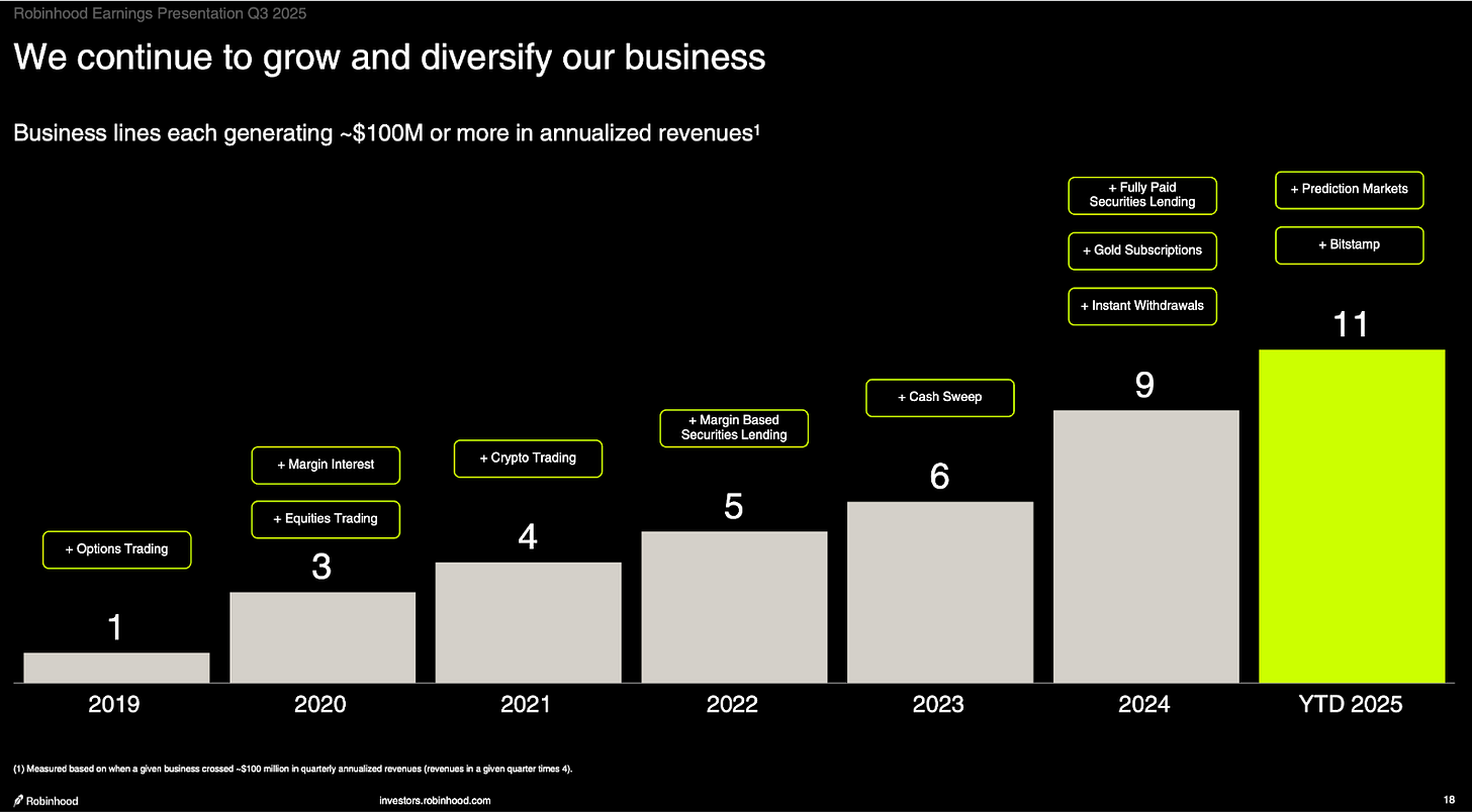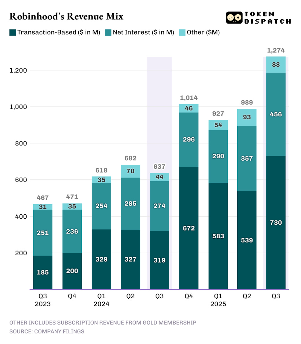In Q3, this “sleeping cash” generated $456 million through interest on liquidity and option-sweep balances, margin loans, and securities lending, one of the most unglamorous but dependable engines in Robinhood’s business.