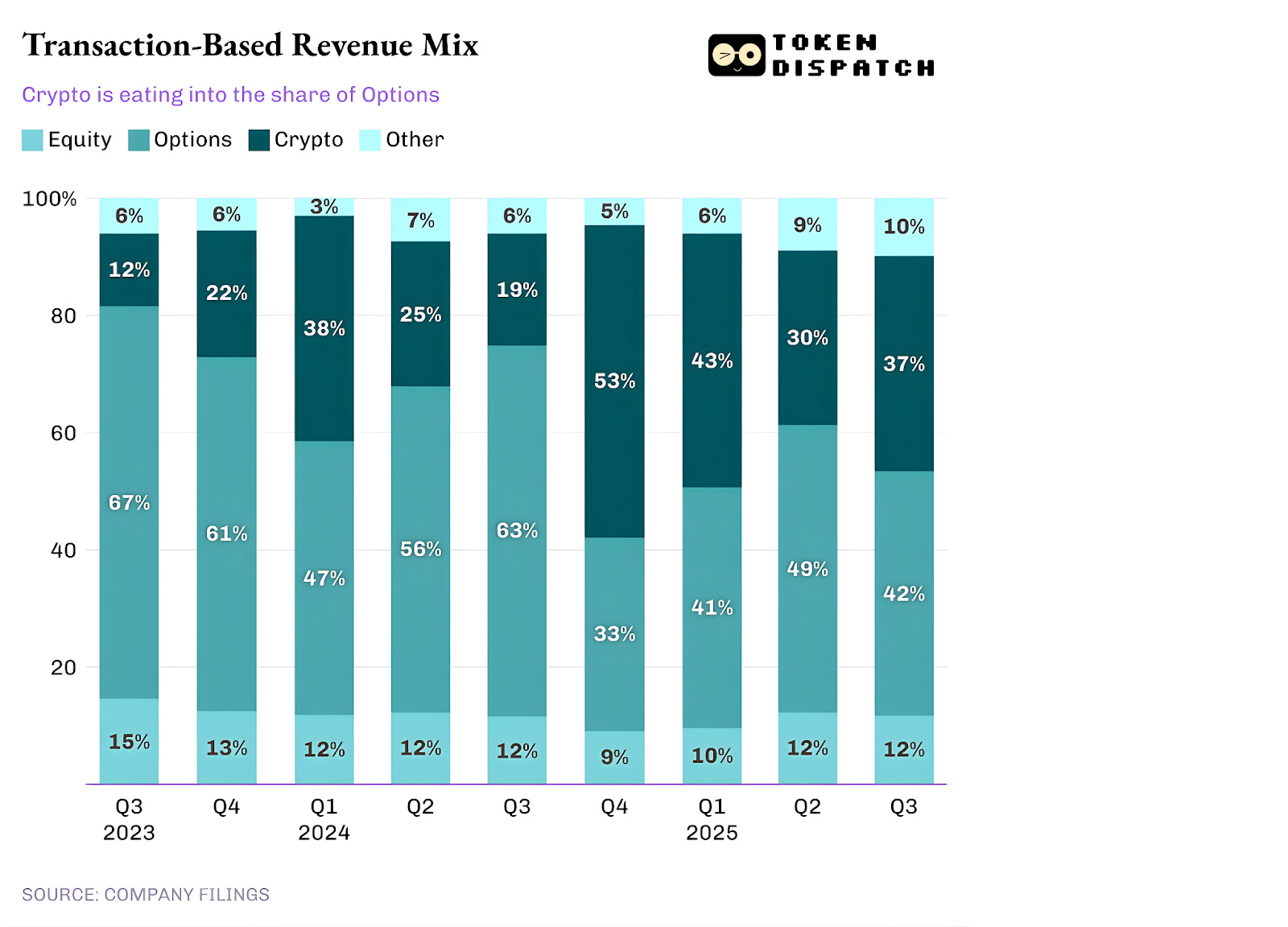 Crypto’s share has stayed above 30% for the last four quarters, accounting for $268 million out of $730 million in transaction-based revenue during Q3 2025. It shows that although equity options still dominate the revenue, crypto has become the gateway for new deposits.