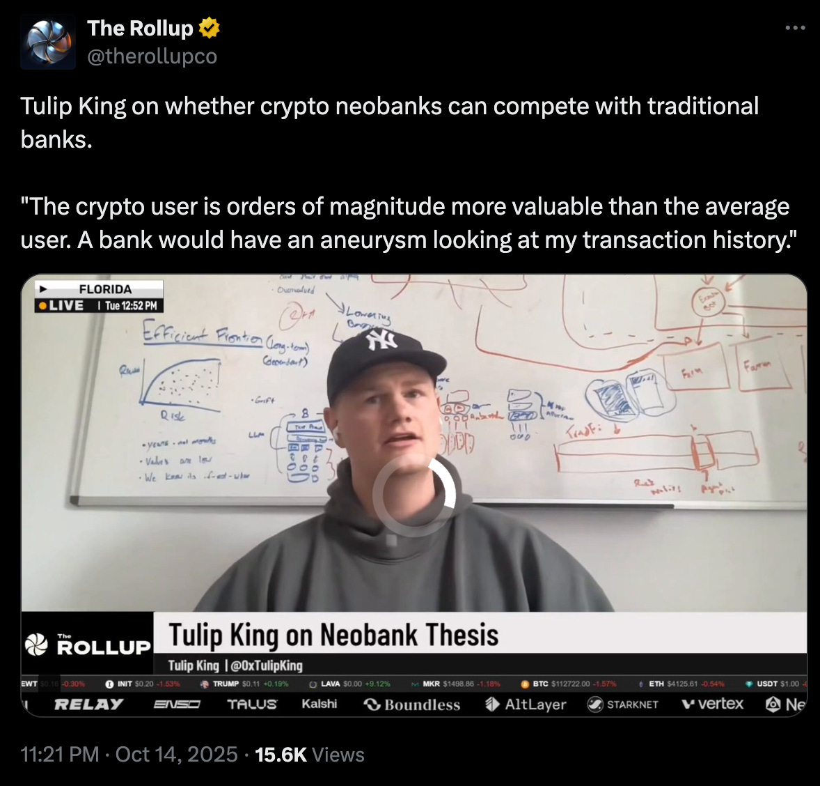 There’s another reason why crypto neobanks can compete despite their small scale: the users are fundamentally more valuable. The average American has around $8,000 in their checking account. Crypto-native users routinely move six and seven figures between protocols, chains, and platforms. They generate transaction volume that would take hundreds of traditional banking customers to match. This changes the unit economics completely. A crypto neobank doesn’t need millions of users to be profitable. It needs thousands of the right users. Traditional banks optimised for scale because each customer generates modest revenue. Crypto neobanks can build sustainable businesses with smaller user bases because each customer is worth 10x to 100x more in transaction fees, interchange revenue, and assets under management. The math just works differently when your average user isn’t depositing a $2,000 paycheck twice a month.
