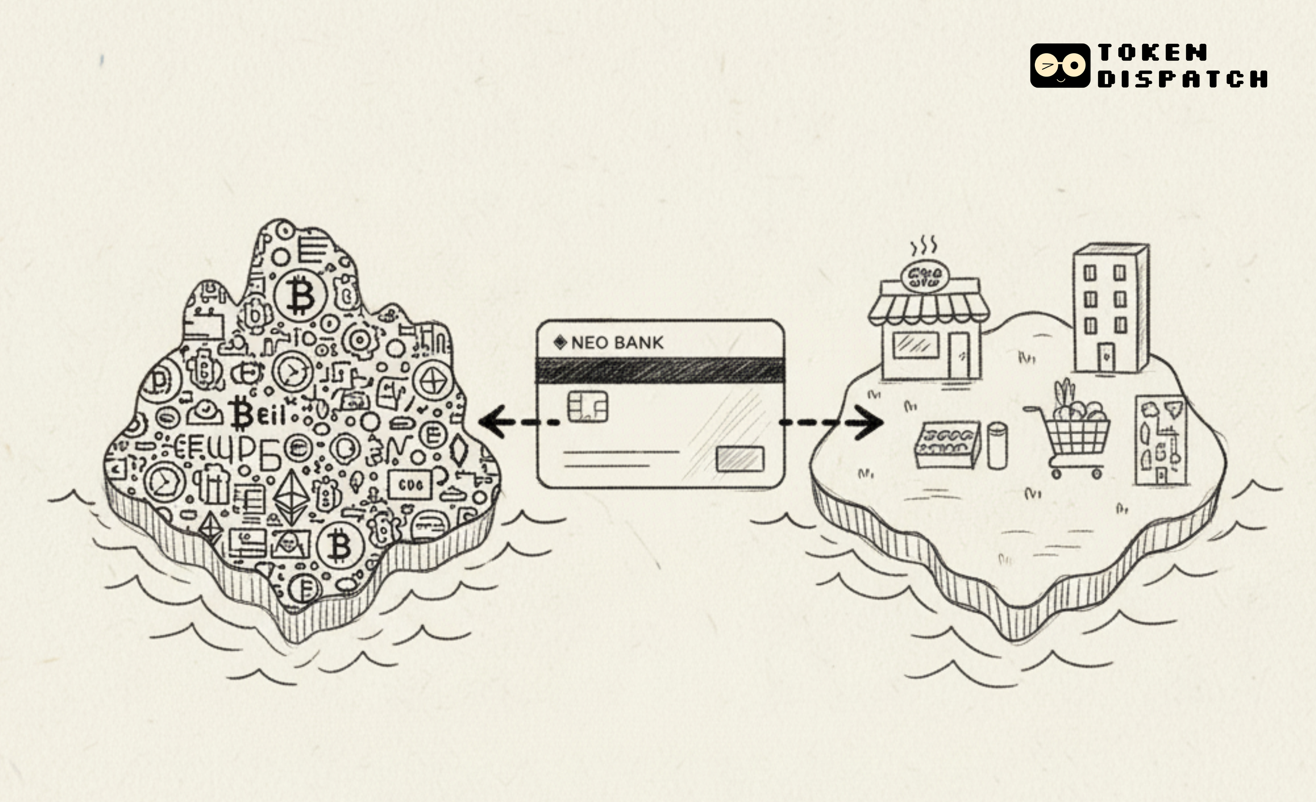 Crypto neobanks make the coordination problem invisible. You spend stablecoins from your self-custody wallet. The neobank converts them to dollars and settles with the merchant through Visa or Mastercard. The coffee shop gets dollars in their bank account like always. They don’t know crypto was involved.