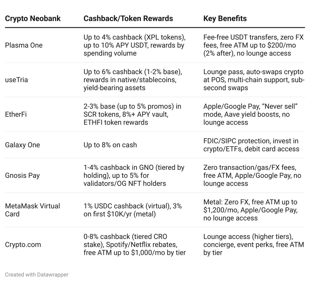The competitive landscape has exploded in the past year. Plasma One launched as the first stablecoin-native neobank, focusing on emerging markets with restricted access to dollars. Tria, built on Arbitrum, offers self-custodial wallets and gasless transactions. EtherFi has evolved from a liquid restaking protocol to a full neobank with $11 billion in TVL. UR by Mantle is targeting Asia with a Swiss regulation and compliance-first positioning.