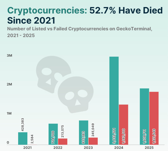 CoinGecko's latest research reveals that Q1 2025 accounted for nearly half (49.7%) of all crypto failures since 2021. Of the 7 million tokens tracked since 2021, 52.7% have now ceased trading entirely.