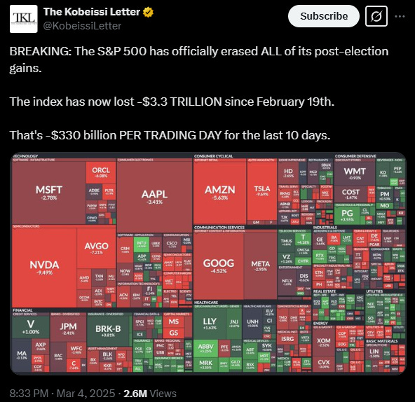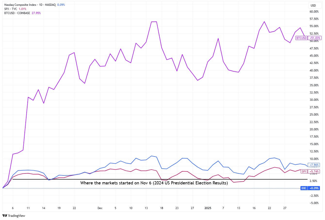 The disappointment rippled beyond crypto. Major US indices have now surrendered their post-election gains.