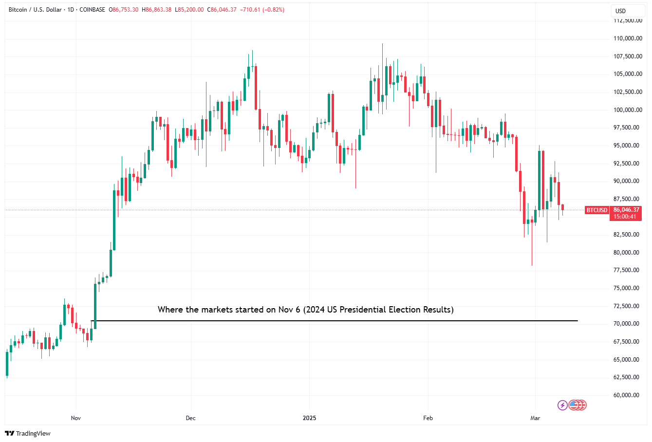 Although Bitcoin has not gone back to the pre-election price range, it went as low as $78,400 — less than 10% away from the pre-election all-time high of $73,712.