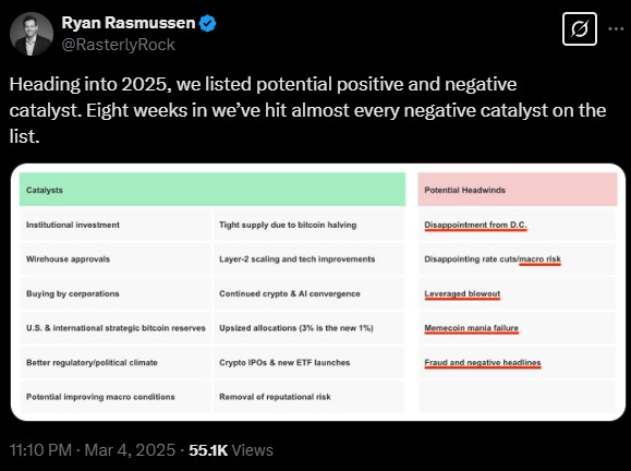 As Ryan Rasmussen of Resterly Rock noted on Twitter, we've now hit "almost every negative catalyst" from their 2025 risk list – from "disappointment from DC" to "memecoin mania failure."
