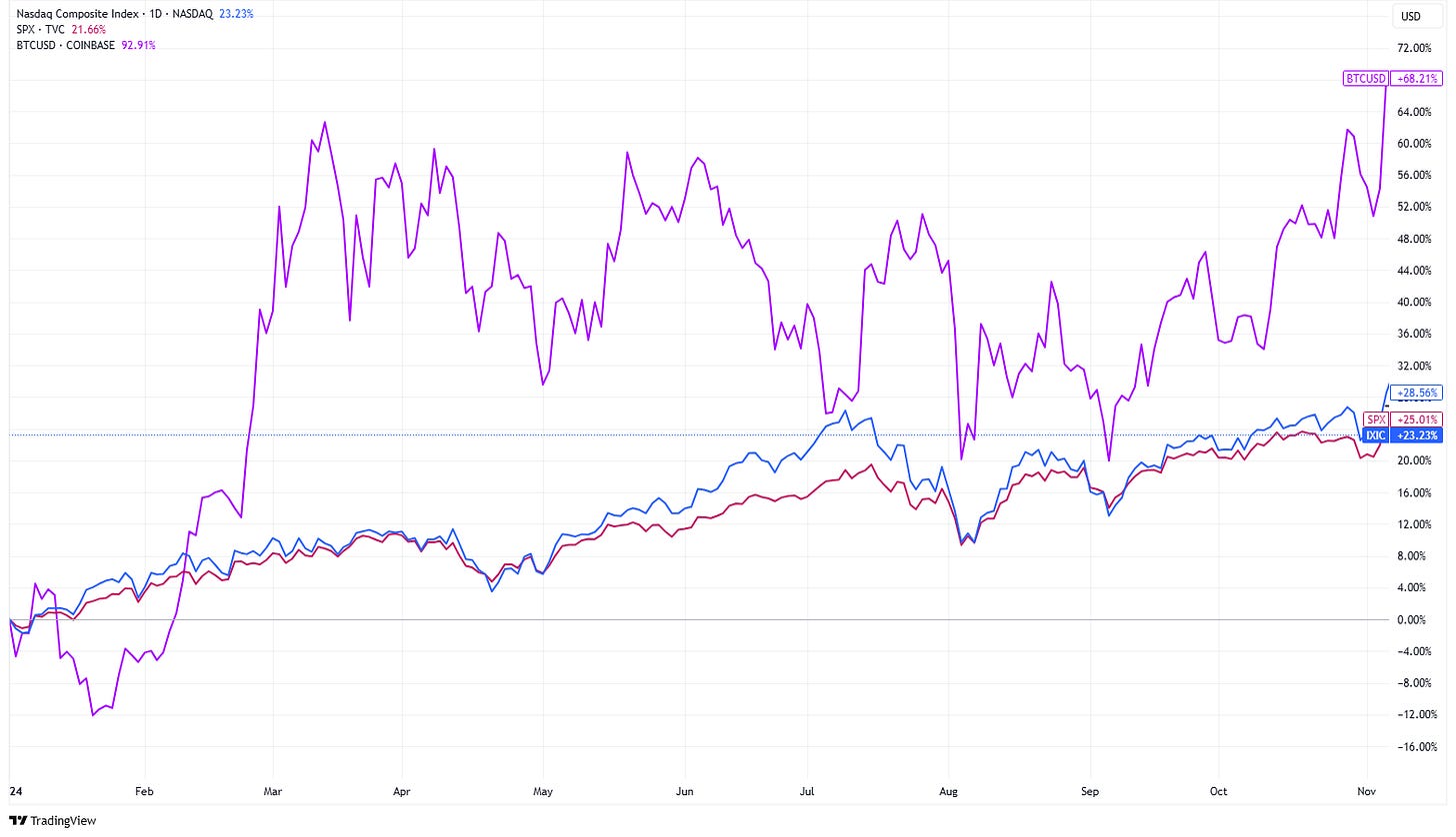 The "Trump trade" narrative crystallised: a Trump victory would mean friendly regulations, supportive policies, and government legitimisation of crypto. Markets responded accordingly.