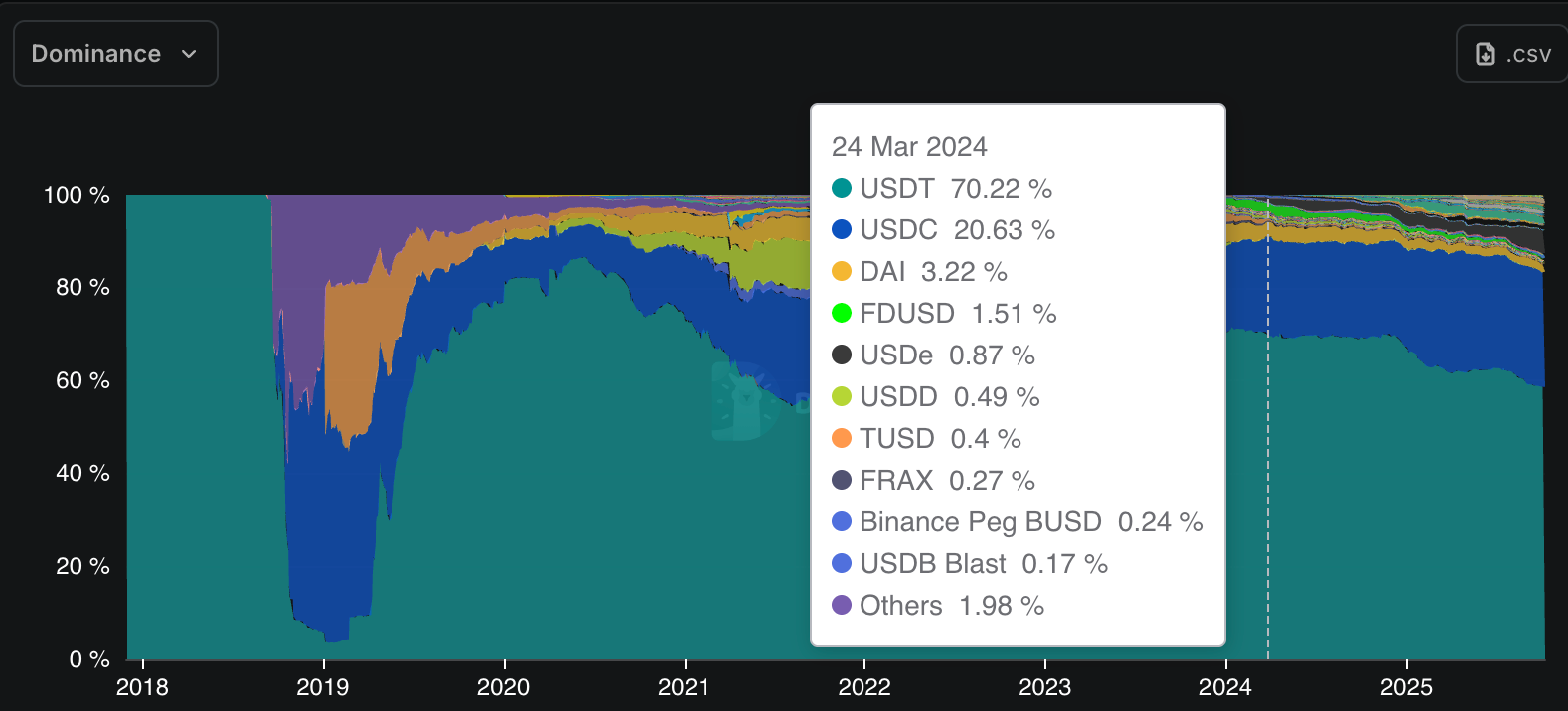 While banks and regulators argue about semantics, something more fundamental is happening. Tether and Circle’s combined market share peaked at 91.6% in March 2024. By late 2025, it had slipped to 86% and it continues to fall. The reason is not just yield-bearing stablecoins. It is that issuing a stablecoin has become radically cheaper and easier.