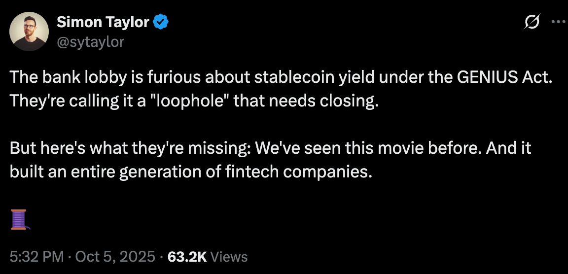 So, banks did what any rational incumbent would do. They lobbied for the GENIUS Act, which passed in July 2025 with explicit language prohibiting stablecoin issuers from paying yield or interest to holders. Problem solved, right?