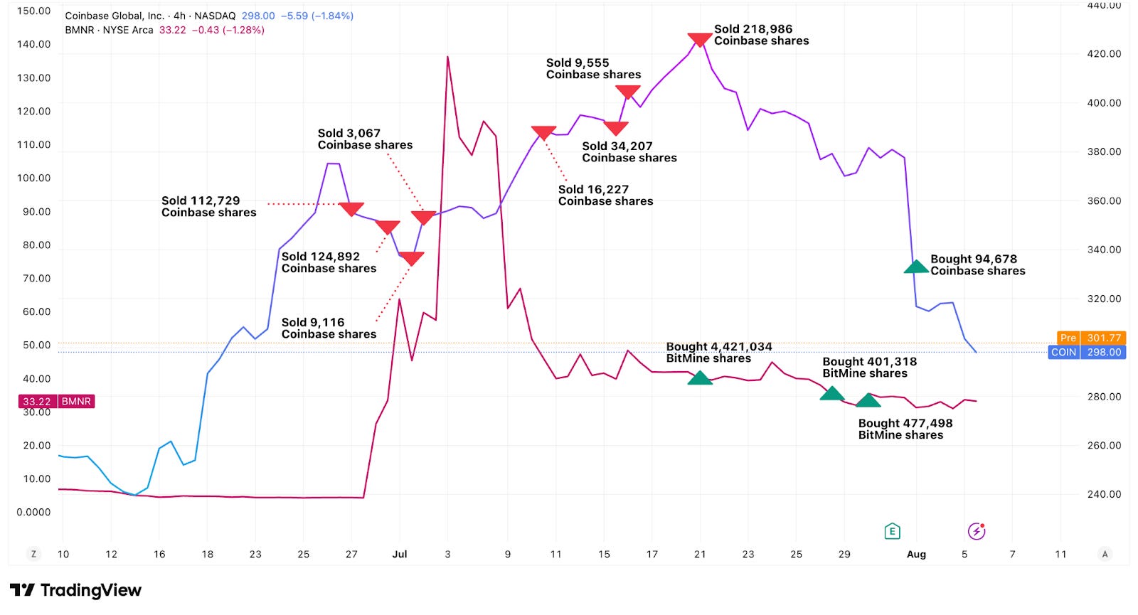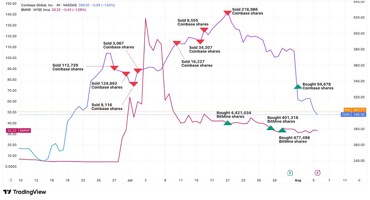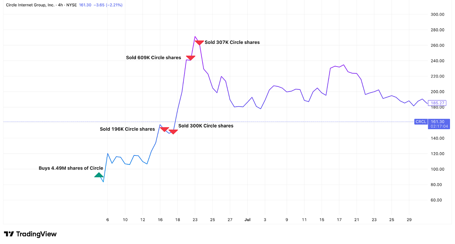 What's interesting about these trades is the timing precision. They sold Circle during a dream rally all the way as it peaked. They jumped into Figma's 250% IPO pop. They sold Coinbase, too, just as it peaked and doubled down after it crashed on disappointing earnings. They bought BitMine during multiple market dips.