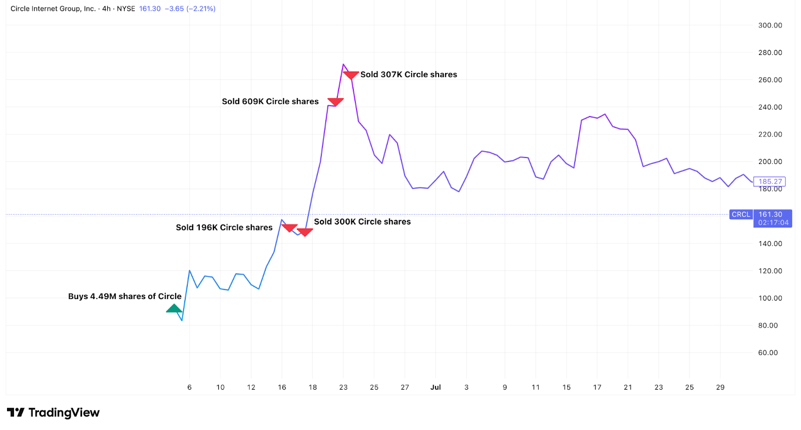 ARK began selling a week before the peak. In total, ARK sold ~1.5 million shares, about 33% of total holdings, worth about $333 million worth of Circle shares during the stock's parabolic rise. That’s over $200 million, or 160%, in booked profit on the shares it had bought on Circle’s Wall Street debut less than three weeks ago.