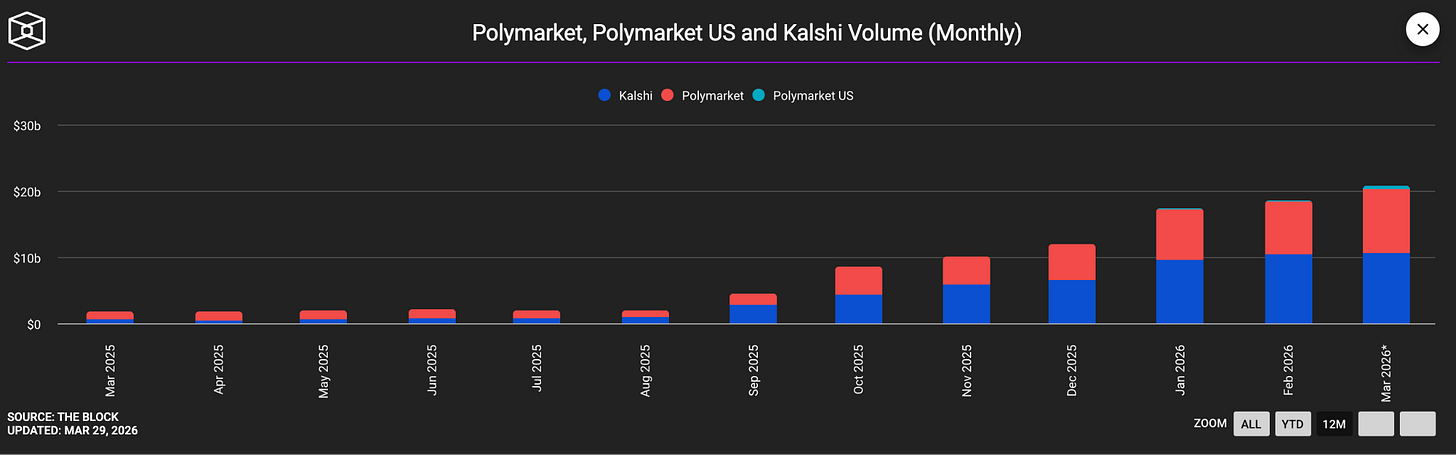 Kalshi reached a valuation of $22 billion in the first quarter of 2026. Polymarket hit $20 billion after securing investment from the Intercontinental Exchange. They have started looking like financial infrastructure companies that have decided, as crypto did in 2015 and 2018 and 2022, that building through the legal uncertainty is better than waiting for it to resolve.