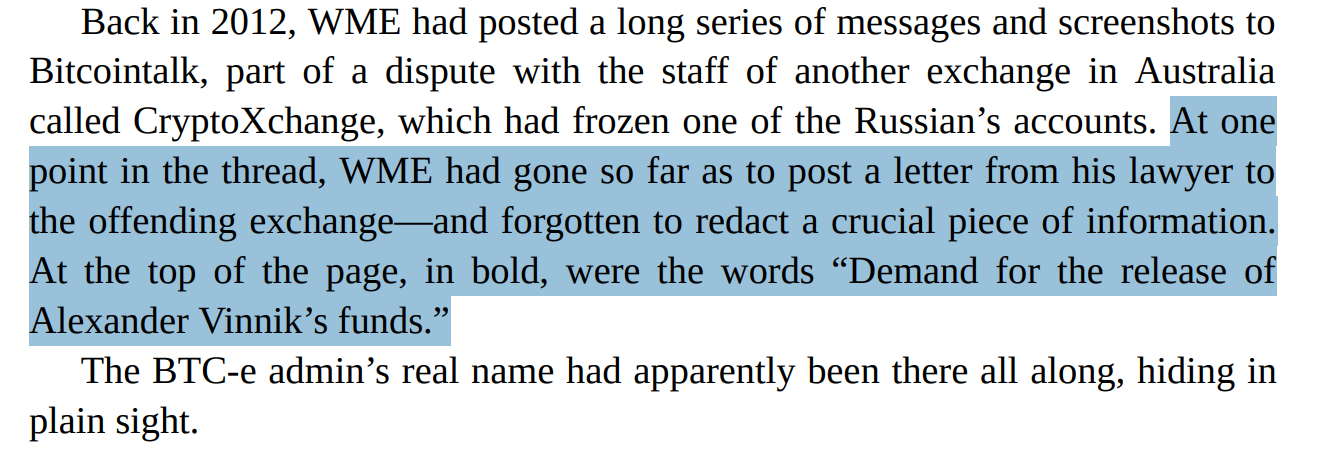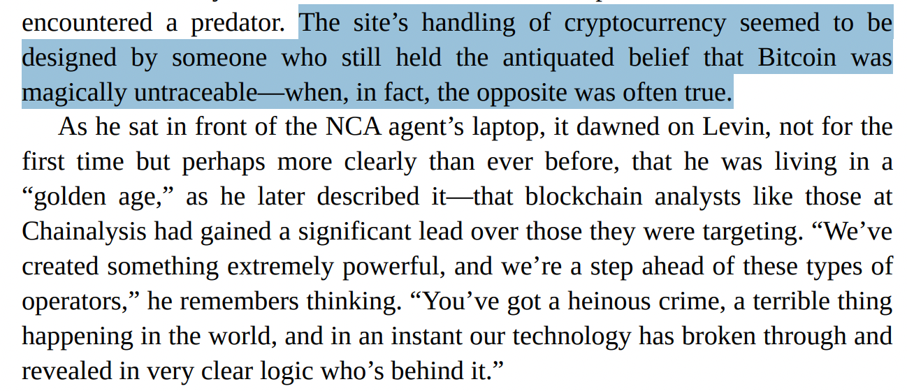 After the first AlphaBay and BTC-e chapters, my mental summary of the middle of this book is that you think we just invented uncensorable money. In fact we bootstrapped a new kind of financial surveillance industry, then gave it a recurring revenue model.