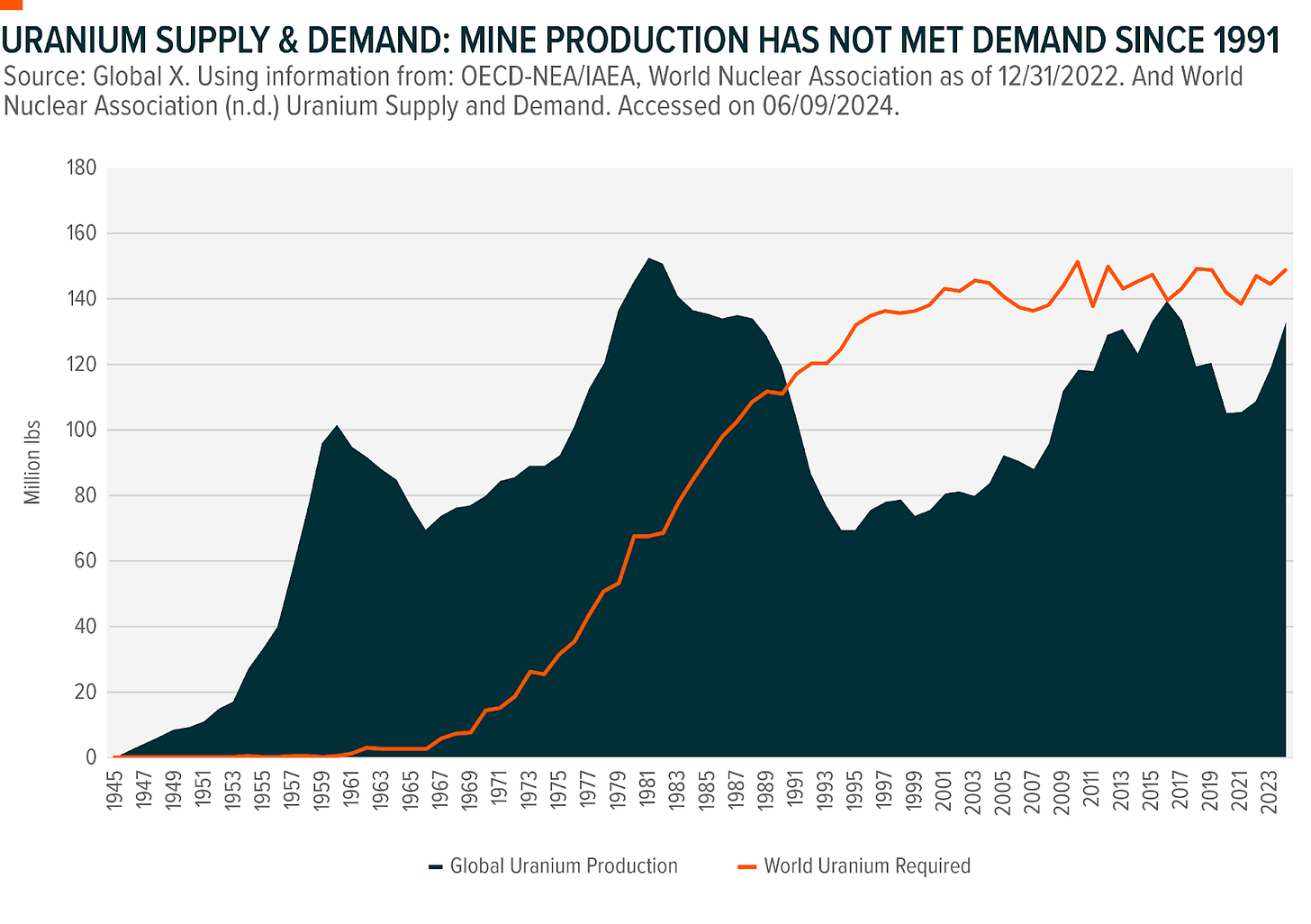 But supply cannot move at the same pace during this period. Opening a new uranium mine or bringing an idled one back online takes years, once permitting, financing, and regulatory approvals are factored in. So, when demand resumes, supply cannot be scaled up to match in the short term. The market adjusts by drawing down existing inventories, and prices rise until new projects finally make sense, even though any new production shows up long after the buying pressure has already peaked.