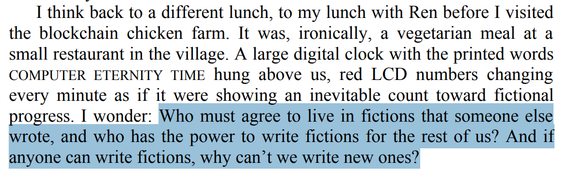Back to the farm. By the time I finished the chapters on chickens and pigs, I thought I had a handle on what Blockchain Chicken Farm was doing. Tech meets countryside. Sensors on animals. AI in barns. Crypto as a paranoia infrastructure. That felt like the shape of the book.