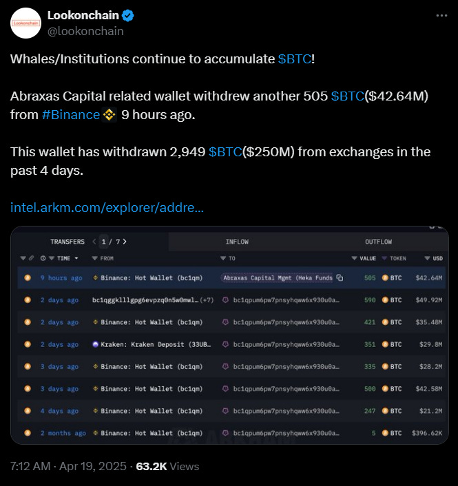 Abraxas Capital removed 2,949 Bitcoin worth over $250 million from exchanges between April 15-19, blockchain intelligence firms Lookonchain and Arkham Intelligence confirmed.