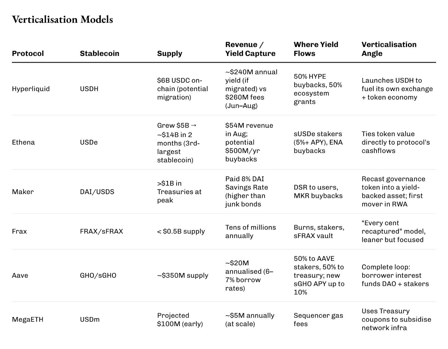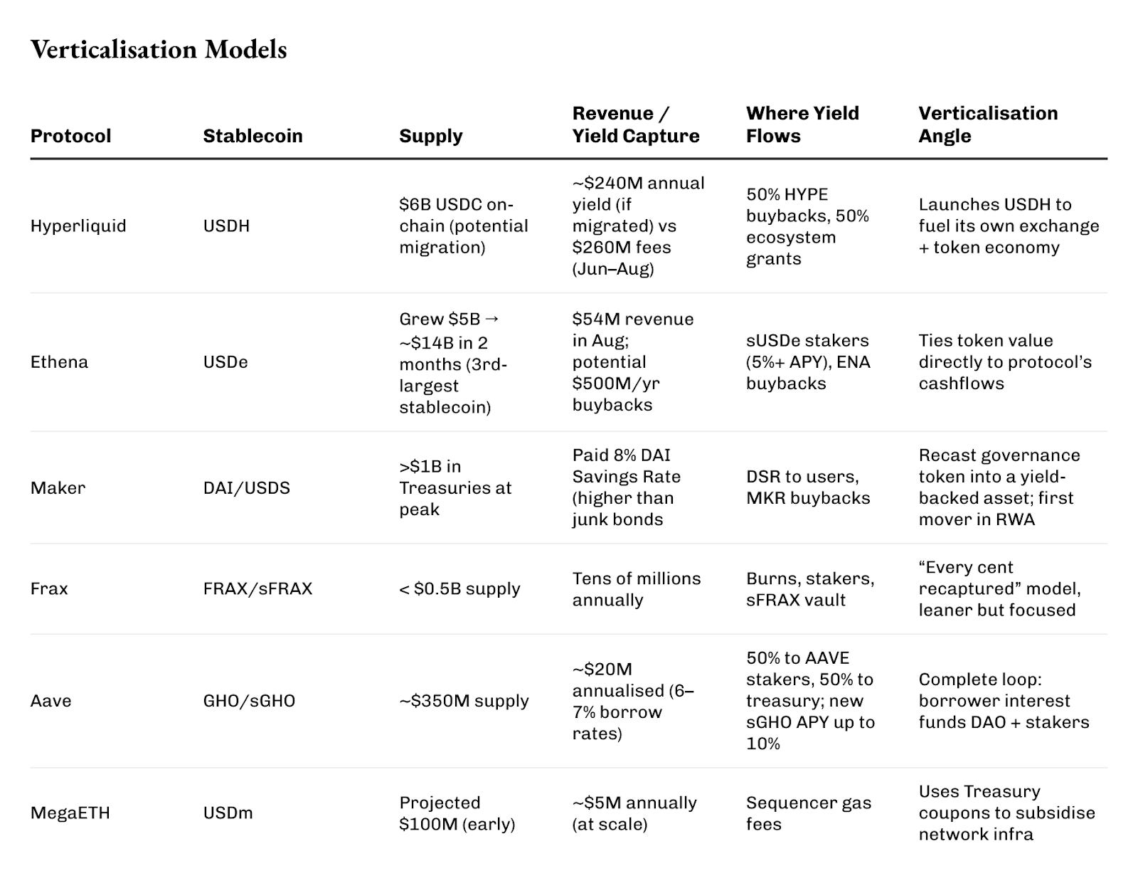 Each protocol is no longer content to depend on someone else’s dollar rails. They’re minting their own coins, capturing the interest that would once have gone to issuers, and looping it back into buybacks, treasuries, user incentives, or even subsidising the plumbing of a blockchain.