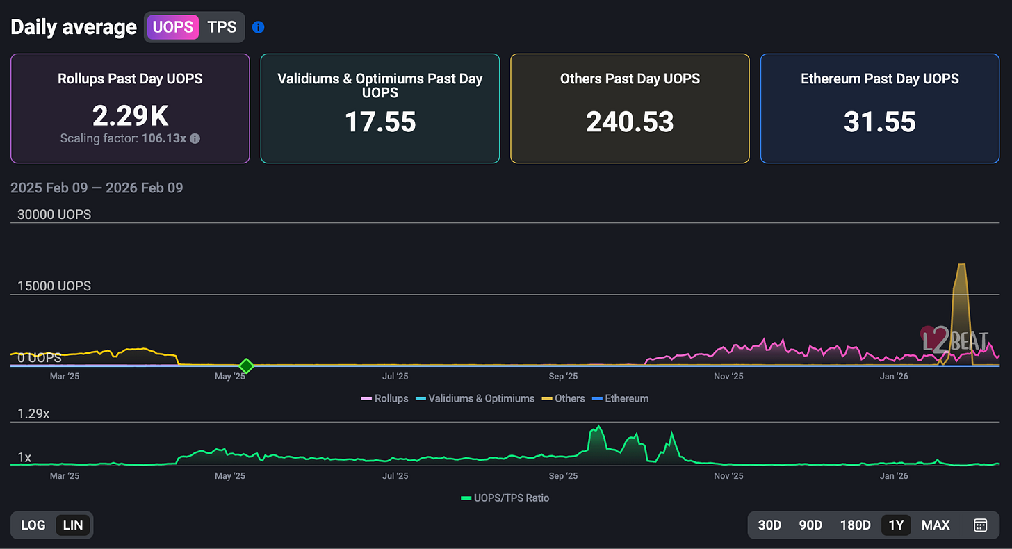 User activity follows the same pattern. Rolluspa averaged 2,290 operations per second over the past day, with a scaling factor of 106x compared to Ethereum’s 31.55 operation per second. But that activity is concentrated. Base and Arbitrum dominate. The long tail barely registers.