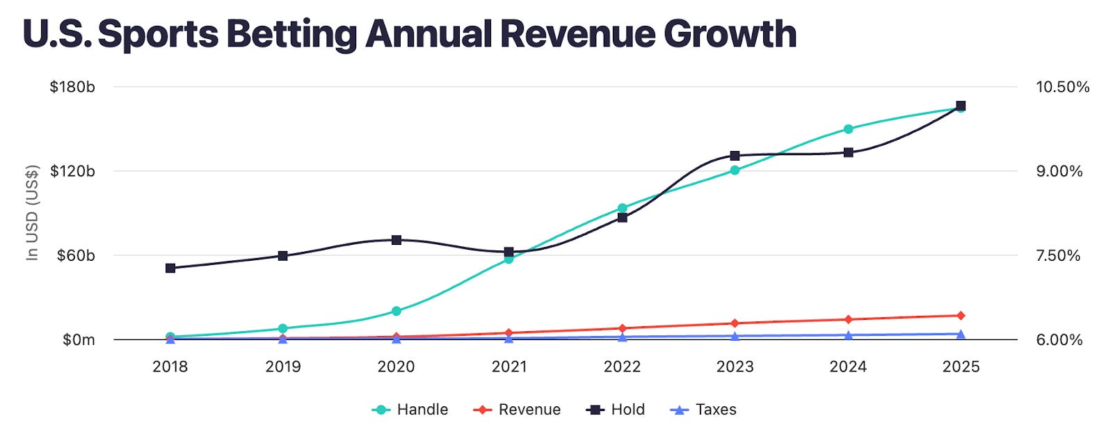In 2025 alone, U.S. sports betting reached approximately $164 billion in annual handle, generating roughly $16–17 billion in operator revenue. In under seven years, wagering layered on top of games has grown into one of the largest recurring revenue streams attached to sports. More than 80% of that activity now happens on mobile, meaning the financial layer runs continuously alongside every game.