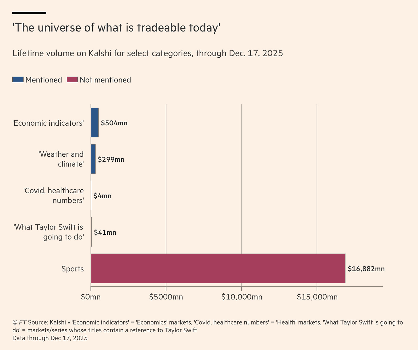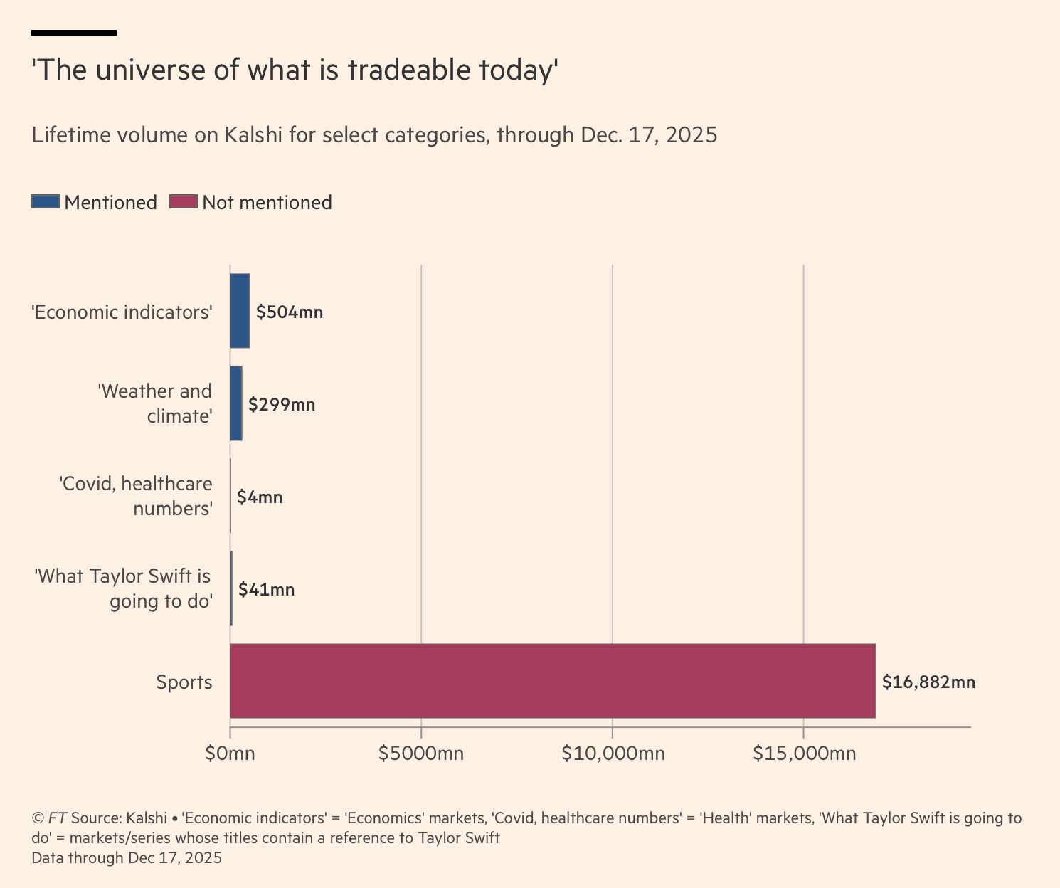 Prediction markets simply amplify that effect. They enable events to trade as financial primitives, which also expands the scope beyond just sports to elections, the box office, and culture to become markets. Sports remain one of the largest categories because it generates constant, structured outcomes.