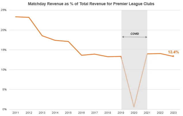 The data reflected the same, between 2011 and 2023, commercial revenue for Premier League clubs grew at an average annual rate of 9.3%, and broadcast revenue at 8.7%, while matchday revenue grew at just 2.9%. Over time, matchday income became a smaller share of total revenue. Media rights and sponsorships became the primary drivers of growth.