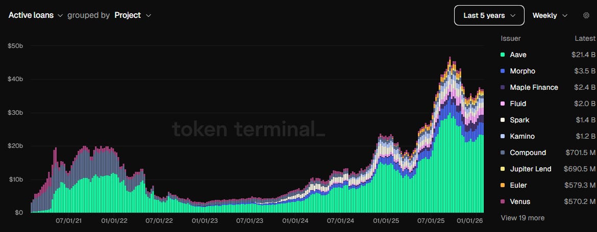 The dashboard shows a solid foundation laid by incumbents, including Aave and Morpho, with active loans exceeding $40 billion over the last few months, more than double the 2022 highs.