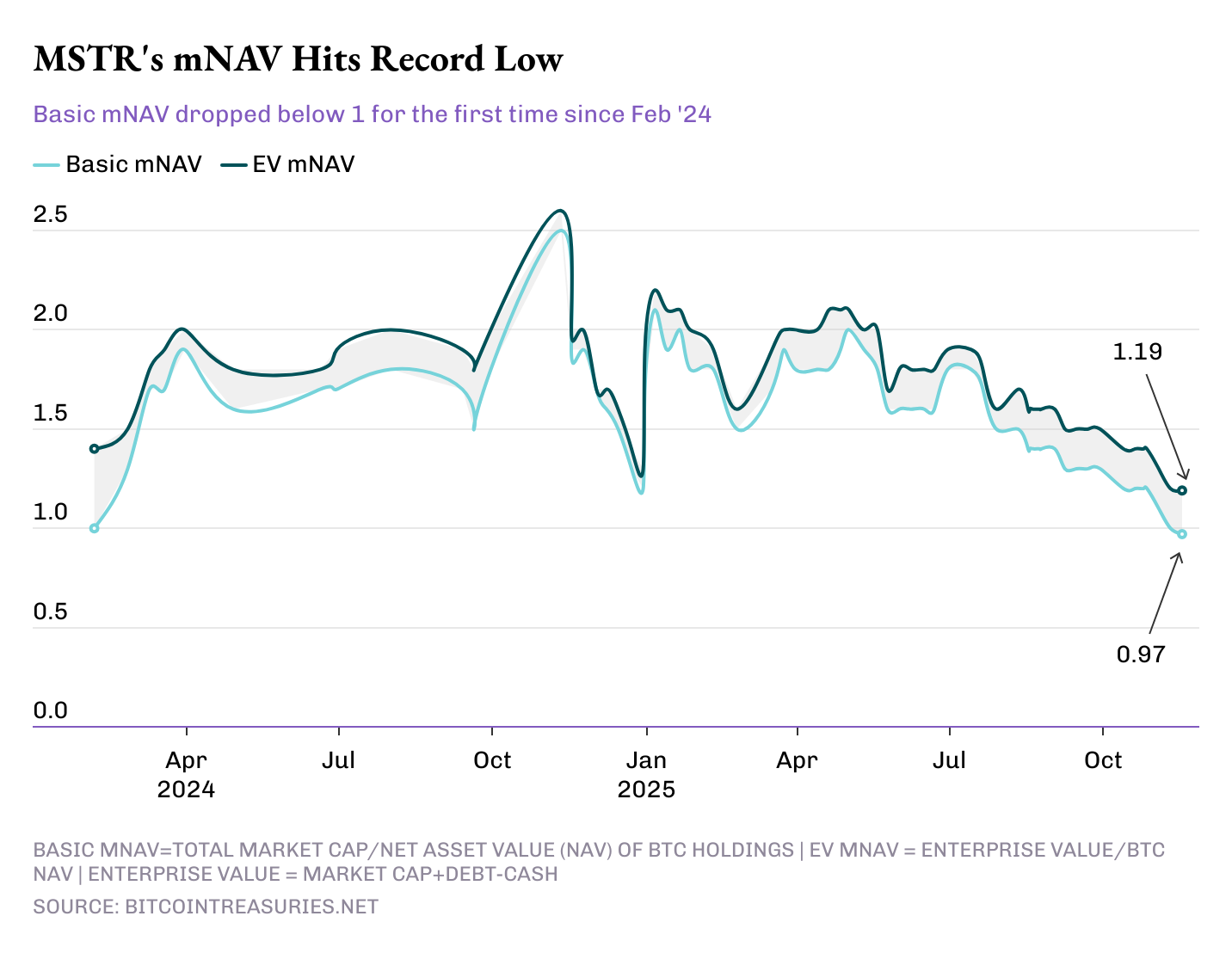 When mNAV is below 1, investors consider the company’s value to be less than the value of the crypto it holds.