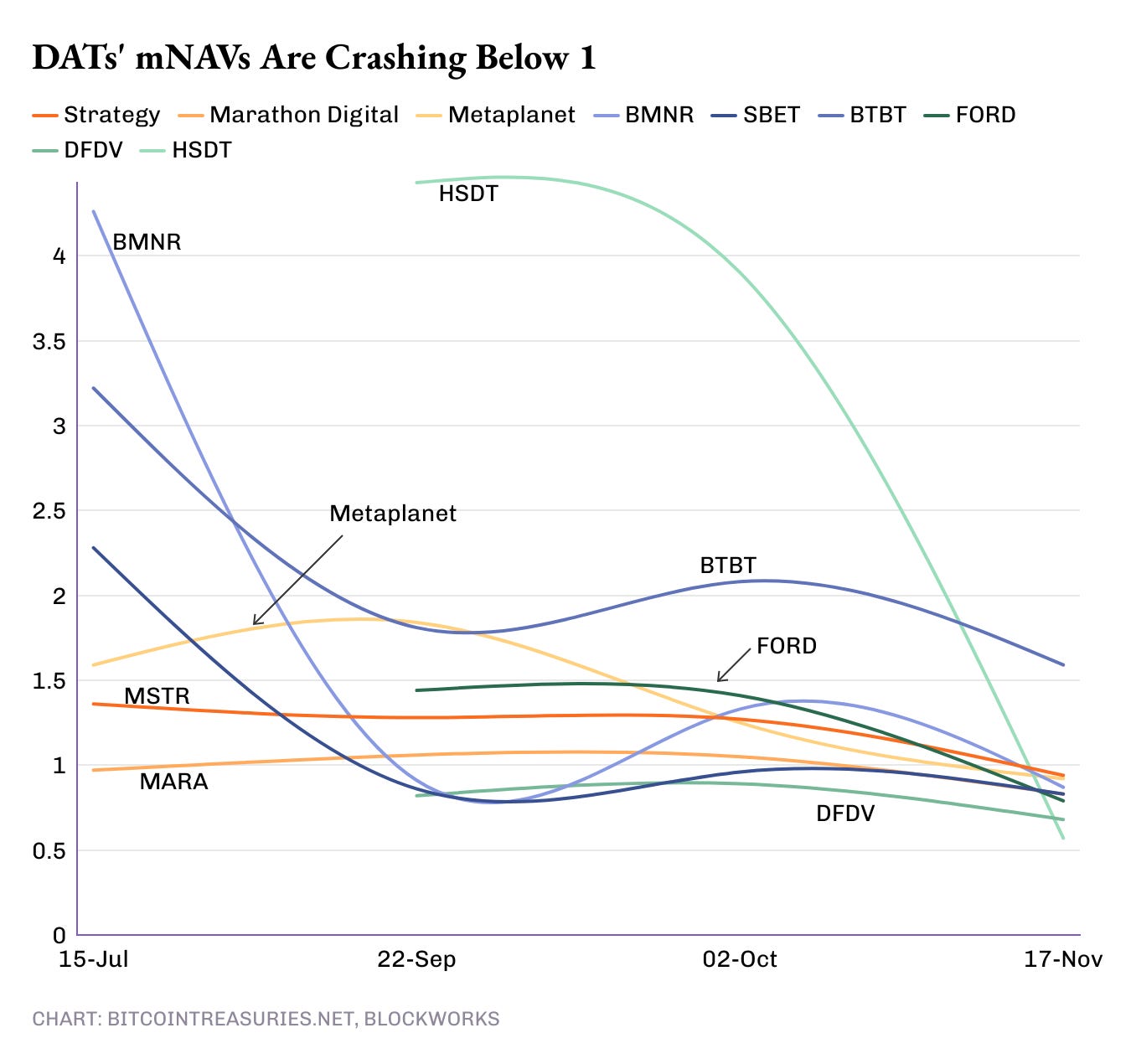 For most of 2025, the mNAVs of crypto-treasury firms have been drifting lower after the initial boost most newly turned DATs experience. Since October, these mNAVs have been falling closer to or below 1.