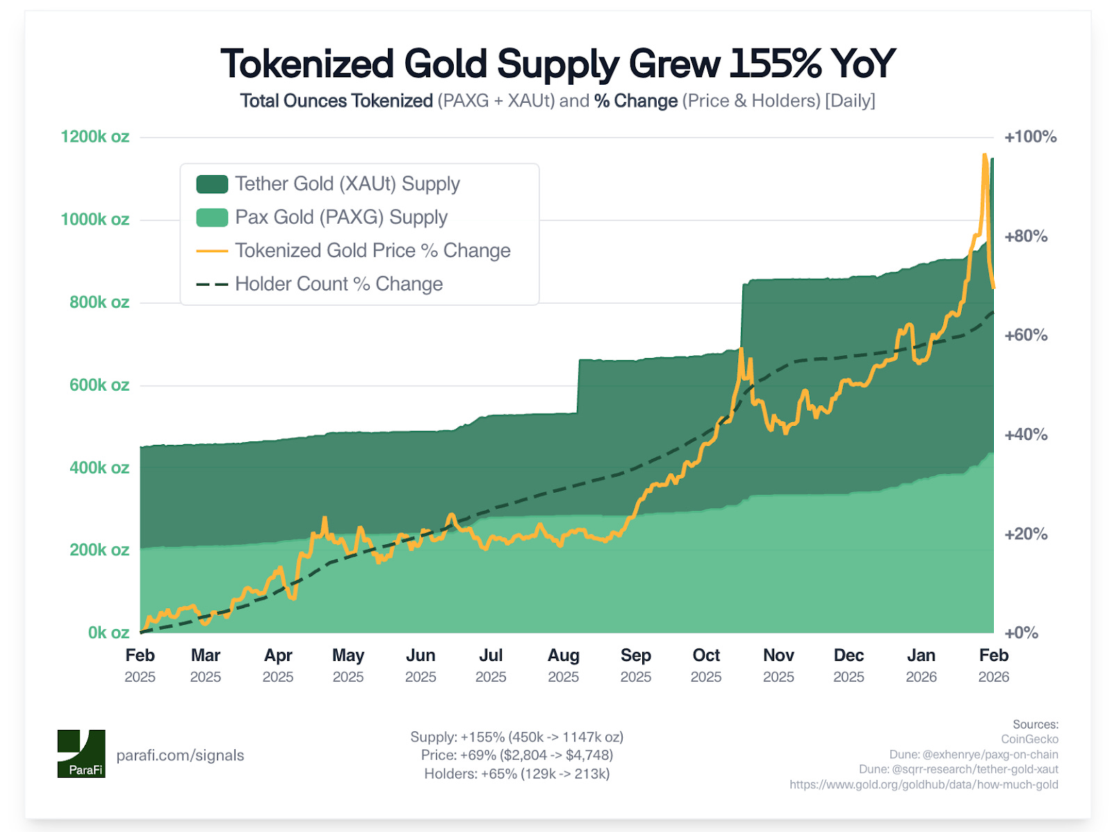 Not because of some complex on-chain dynamic. Not because capital was rotating through sophisticated DeFi strategies. But gold — the commodity — rallied. And the tokens did what they are designed to do: track it. Gold went from $2,600 to $5,600 in twelve months. The tokens followed, faithfully, within fractions of a percent.