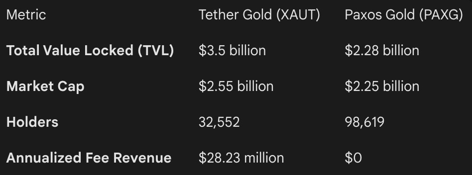The revenue structures reveal the philosophical split most clearly. XAUT generates $28 million a year from its 0.25% purchase and redemption fee. PAXG generates zero from transfer fees. One is extracting value from flow. The other is subsidising adoption to build a base. One is running a business today. The other is building a moat for tomorrow.