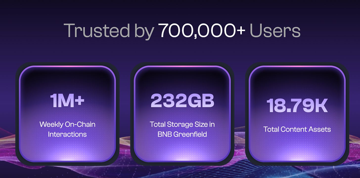 The technical implementation uses BNB Greenfield for primary storage, with additional integrations across Arweave for permanent archival, Filecoin for cost-efficient bulk storage, and CESS for privacy-enhanced storage. This multi-chain approach optimises for cost, durability, and performance depending on content requirements.