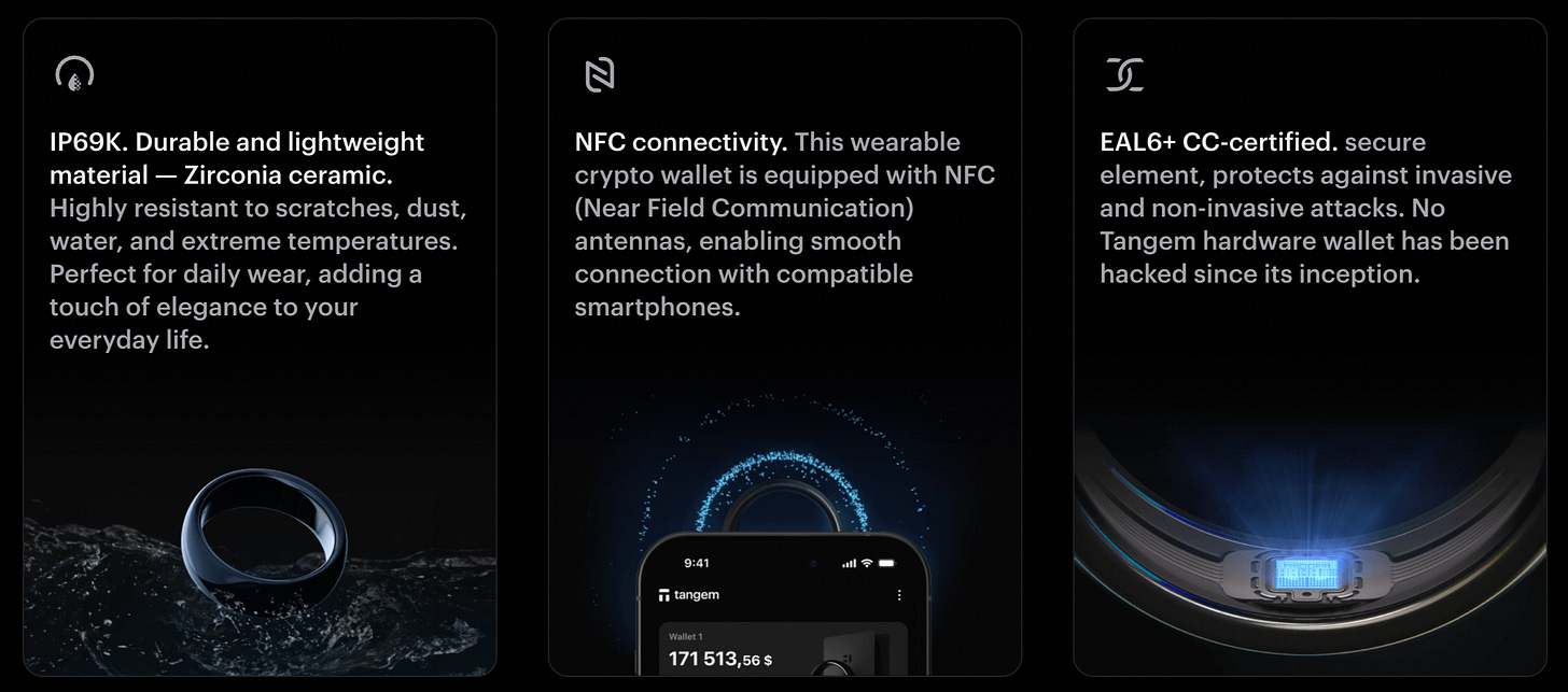 The Ring Factor: Tangem's most ambitious product is the Tangem Ring, a ceramic smart ring containing the same EAL6+ secure chip. You literally wear your wallet. The ring includes two backup cards and offers the same security as the cards but in a form factor that makes spontaneous crypto transactions as simple as tapping your hand to your phone.