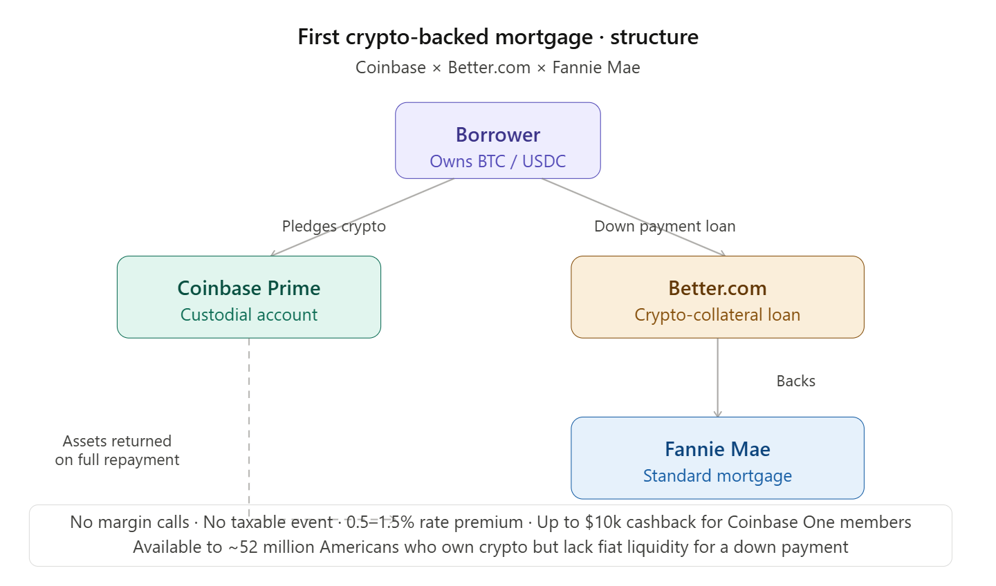 Better Home & Finance and Coinabse launched a mortgage product last week where you pledge your Bitcoin or USDC as collateral for the down payment. You get a Fannie Mae-backed loan. You keep your crypto, you do not need to sell it, you do not trigger a capital gains event. And the most important part, even if Bitcoin’s price drops, you don’t lose your home.